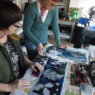 Friend and fellow printmaker, Jane, invited Hayley and I to her studio to try out her heat bed press. Jane has created some most beautiful lampshades and purses to name but a few using this process.